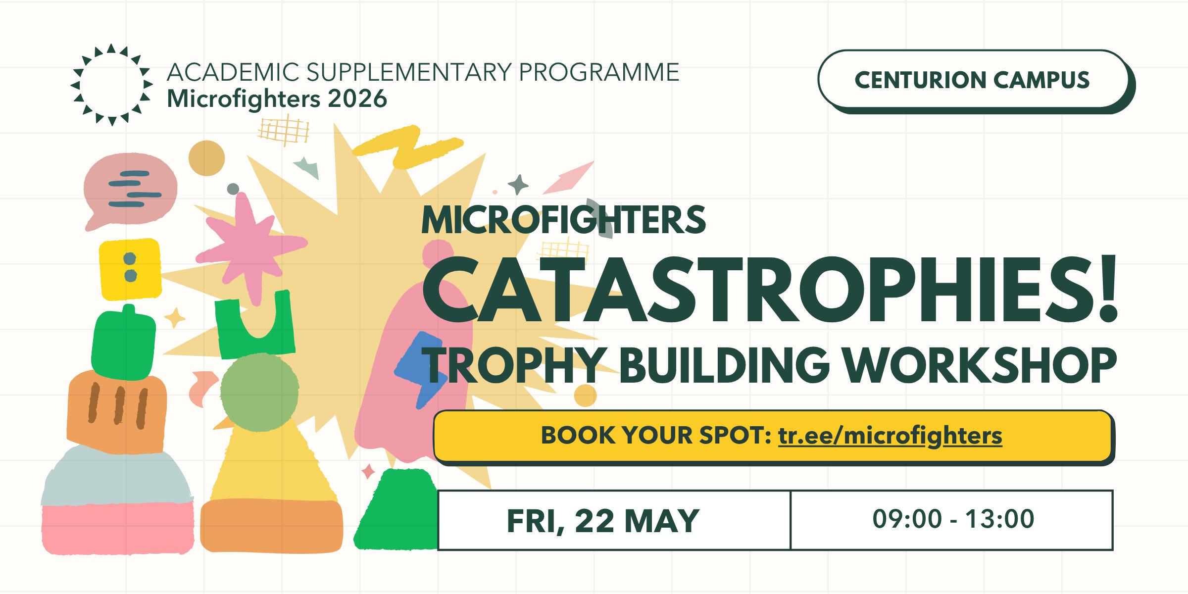 A hands-on trophy construction workshop led by Dalene Meyer, Azel Viljoen, and Welmarie Momberg. Participants will transform found objects and offcuts into totem-inspired trophies—selected pieces will become the official awards for this year’s Microfighters event.